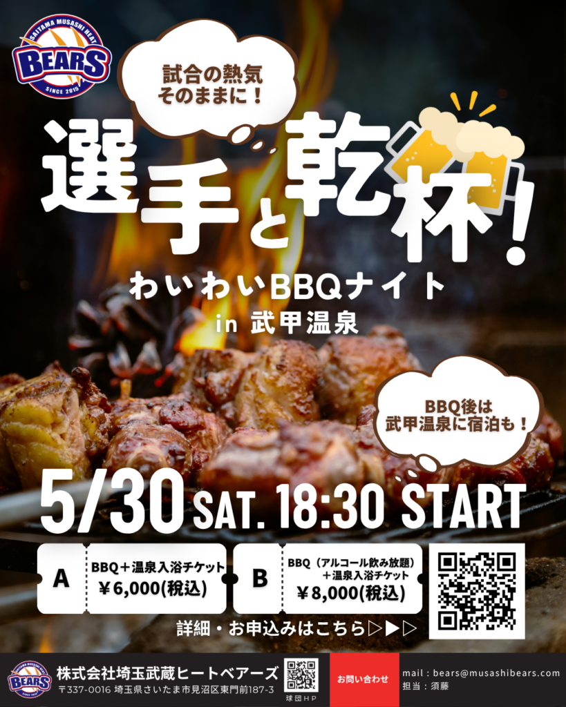 5月30日(土)福島レッドホープス戦終了後、選手と一緒にBBQを楽しめる特別イベントを開催いたします!
