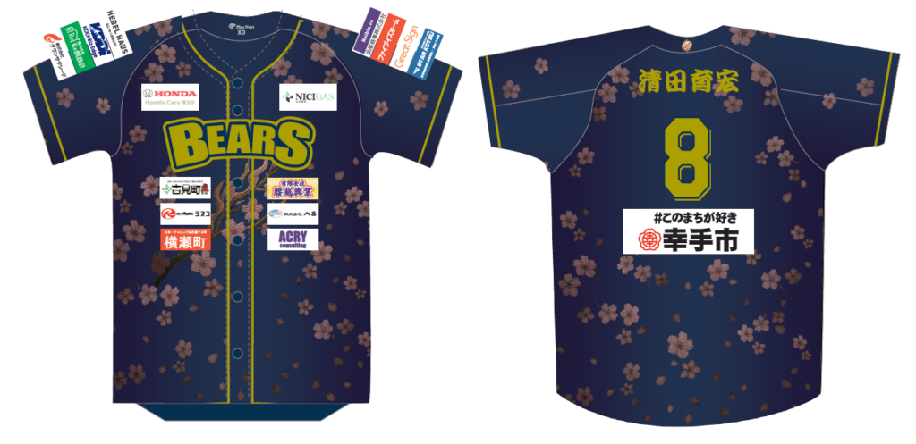 今回のコラボユニフォームは、幸手市の象徴である桜をモチーフに、濃紺を基調とした重厚感あるデザインに金色をあしらい、力強さと気品を表現しました。さらに、背番号上部には漢字表記のネームを採用し、日本らしい迫力と特別感を演出しております。