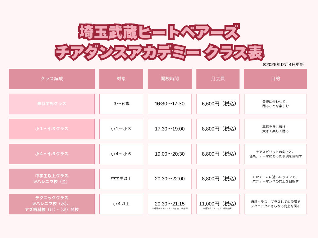 ※クラス編成、受講料などに変更がある場合は、 随時更新いたします。